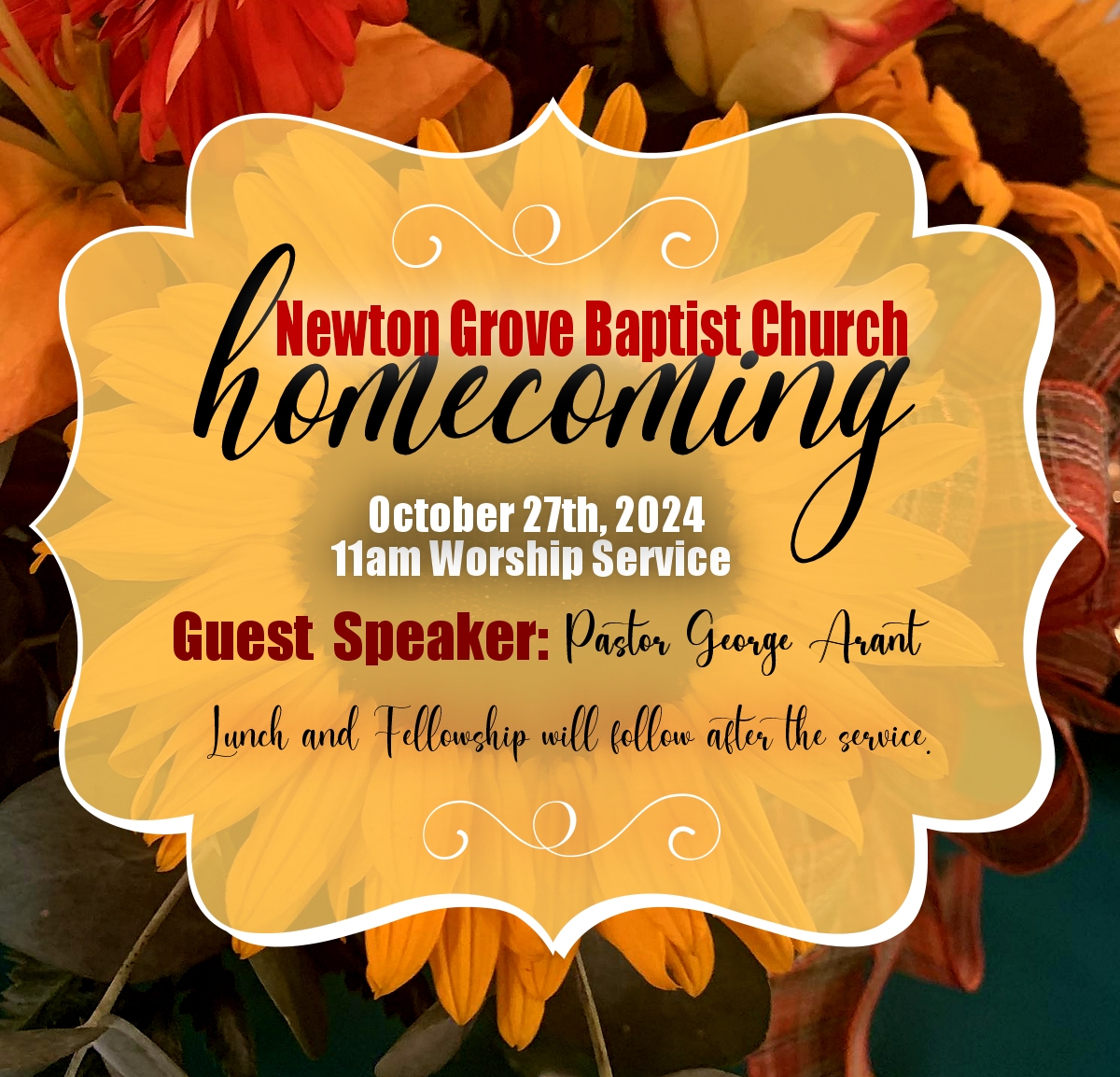 We’re inviting everyone to join us on October 27th, Sunday, for our Homecoming at 11am. Our Guest Speaker will be Pastor George Arant. Lunch will be served following the worship service.